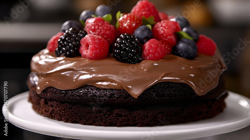 Delicious chocolate layer cake adorned with fresh seasonal berries and rich ganache