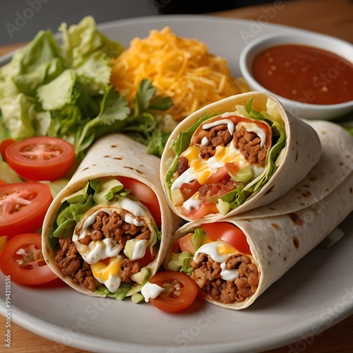 Delicious Classic Burrito with Fresh Ingredients assortment Served with some salad, Tasty delicious burrito wrap roll with meat, pepper, avocado, rice, beans