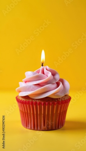 Delicious cupcake, single lit candle, yellow backdrop, treat, bright, party