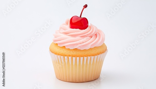 Delicious cupcake with pink frosting and cherry on top, isolated on white background