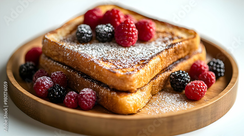 Delicious French toast topped with fresh berries and dusted with powdered sugar on a wooden plate. Perfect for breakfast.