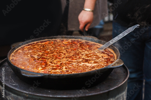 delicious goulash in big bowl with spoon on open grill, outdoor kitchen. food festival in city. tasty food, food-court. summer picnic. hungarian traditional meal