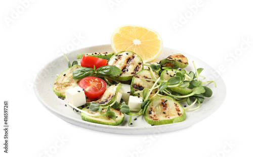 Delicious grilled zucchini slices served with feta cheese, tomatoes and lemon on white background