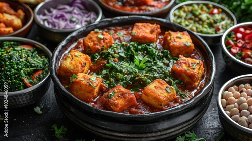 Delicious homemade paneer curry served with vibrant accompaniments in a rustic kitchen setting. Generative AI