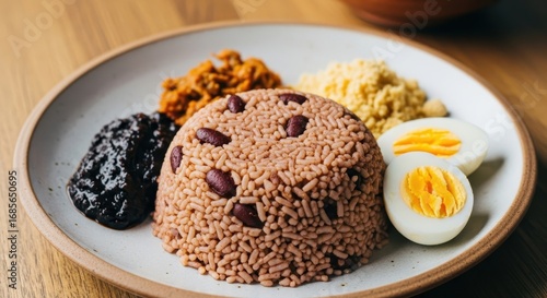 Delicious Jamaican Rice and Peas with Ackee Saltfish and Fried Dumplings Served on a Plate
