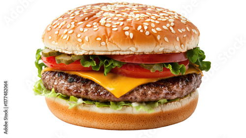 cheeseburger, burger, fast food, foodstuff, food photography, meat, appetising, sesame, american, delicious, patty, cookery, hunger, comfort food, eating, meal, gastronomy, lunch, tasty, lettuce, culinary, snack, dinner, hi-res, juicy, cheese, tomatoes, closeup, eatery, treat, background, bun, visual, rich, satisfying, pickle, classic, cafes, colourful, isolated, texture, photo, white, studio, vibrant