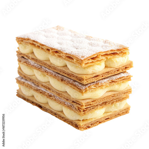 Delicious layered pastry dessert with creamy filling and powdered sugar isolated on transparent background