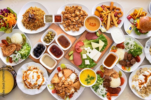 Delicious meat kebab with fresh vegetable salad served with variety of Turkish dishes and appetizers. Top view of assorted Turkish food and meze, tasty and healthy Mediterranean cuisine. Top view.