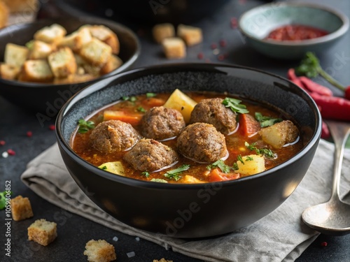 Delicious Meatball Soup in Black Bowl with Croutons - European Cuisine Flat Lay