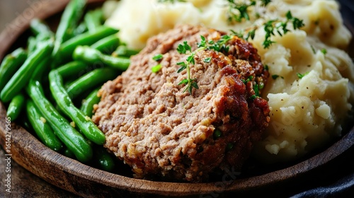 Delicious Meatloaf with Mashed Potatoes and Green Beans on Plate
