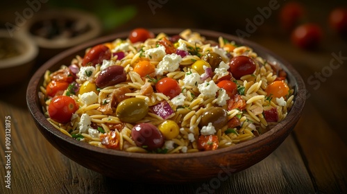Delicious mediterranean orzo salad kitchen recipe rustic setting close-up healthy eating concept