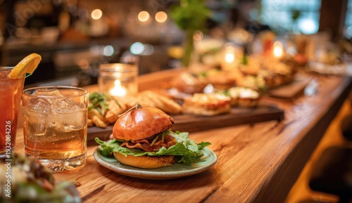 burger, mini, food, bar, wooden, table, eatery, dining, epicure, snack, cookery, delicious, tasty, savoury, meal, dish, plate, serving, buffet, party, gathering, social, casual attire, comfort, epicure, gastronomy, homemade, fresh, ingredient, meat, beef, bun, lettuce, condiment, drink, cocktail, glasses, ice, background, blur, bokeh, lighting, warm, cosy, interior, modern, rustic