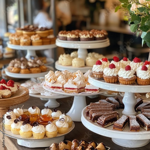Delicious pastries displayed on tiered stands at a cafe