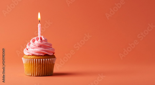 Delicious Pink Frosted Cupcake with Burning Candle on Orange Background
