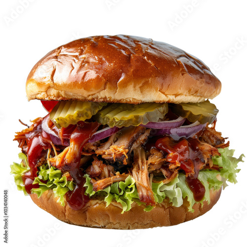 Delicious pulled pork sandwich with lettuce, pickles, and onions served on a soft bun with barbecue sauce for a satisfying meal