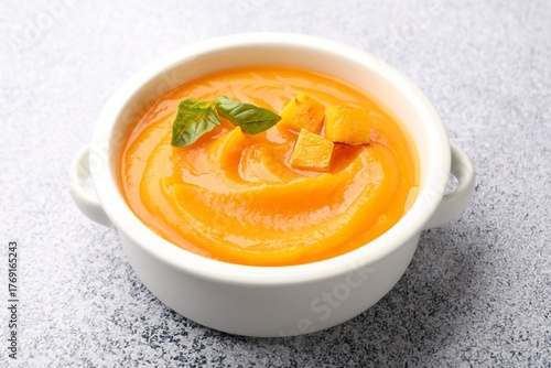 Delicious pumpkin cream soup with basil served on grey table, closeup
