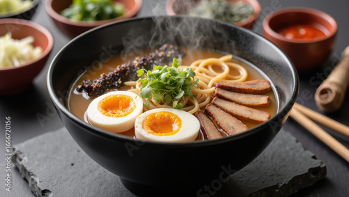 ramen, bowl, noodle, egg, meat, herb, broth, asian, cookery, hot, savoury, meal, delicious, comfort, food, epicure, eatery, dining, culinary, traditional, japanese, ingredient, steaming, flavorful, black, presentation, fresh, appetising, chopstick, side, garnish, rich, dish, hearty, satisfying, warm, authentic, life events, noodle, soup, photo, high, fidelity