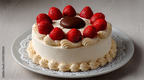 Delicious round cake topped with fresh strawberries and cream