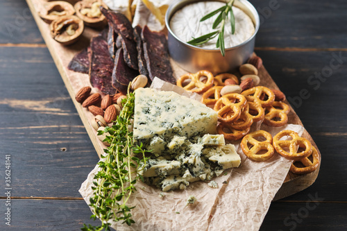 Delicious snacks. Several varieties of cheese, pretzels, nuts and sausage on an old wooden table. Food for a romantic dinner.