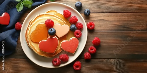 Delicious Stack of Heart-Shaped Pancakes with Berries and Syrup on Rustic Wooden Table for Romantic Breakfast Concept