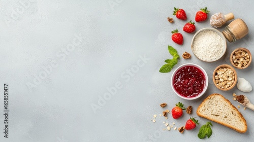 Delicious strawberry jam and bread preparation kitchen food arrangement bright light top view culinary art