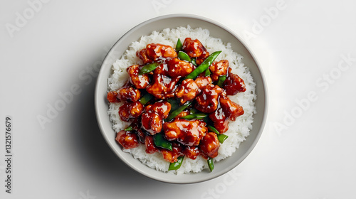 chicken, rice, green beans, stir fry, chinese food, asian cuisine, take-out, dinner, lunch, meal, food photography, tasty, appetising, delicious, healthy, home cooking, receipe, cooking, cookery, bowl, white bowl, topview, studio shot, white background, isolated, protein, vegetable, carbohydrate, savoury