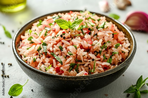 Delicious tomato rice with basil garnish high resolution picture