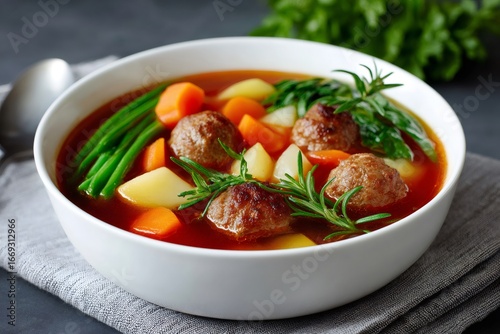 Delicious tomato soup with meatballs, potatoes, carrots, green beans and rosemary in a white bowl