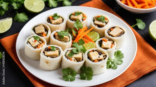 vegan, sushi, cilantro, vegetable, plate, garnish, cookery, culinary, food, dish, epicure, healthy, fresh, ingredient, rice, tofu, carrot, mushroom, lime, asian, japanese, vegetarian, meal, diet, dining, kitchen, table setting, eatery, snack, serving, artistic, platter, decorative