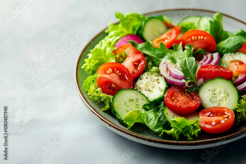 Delicious vegetable salad with fresh cucumbers, tomatoes, red onions and green salad leaves, perfect for showcasing Mediterranean flavors in restaurant menus or food magazines.