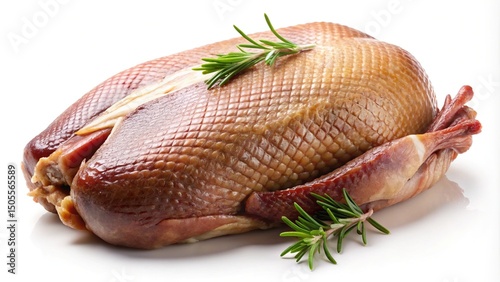 Delicious whole roasted duck, garnished with fresh rosemary, on white background