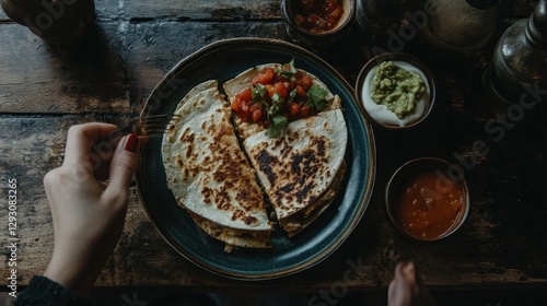 Deliciously Grilled Quesadilla with Melted Cheese, Fresh Salsa, and Avocado Dip on Rustic Wooden Table