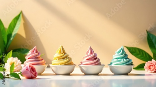 Delightful Pastel Swirls of Frozen Dessert in Elegant Bowls, Decorated with Lush Greenery and Delicate Blossoms
