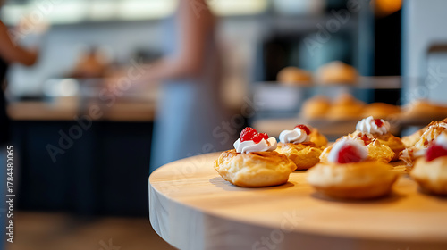Delightful pastries topped with cream and fresh berries, beautifully displayed on a wooden table in a cozy bakery setting, tempting treats for any sweet tooth.