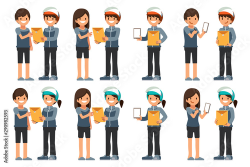 male, man, female, woman, staff, employee, letter, document, folder, client, buyer, service, character, cartoon, people, person, friendly, friends, work, men at work, send, deliver, delivery, carry, shipment, shipping, motorcycle, drive, express, fast, race, business, walk, order, company, speed, punctual, hurry, prompt, quick, transport, transportation, commerce, online, home, confirmed, accepted, illustration
