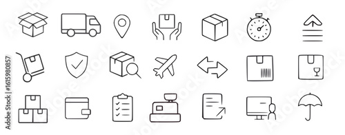 delivery, logistic, shipping, cargo, parcel, box, package, truck, van, transport, aeroplane, express, courier, warehouse, barcode, destination, tracking, security, protection, umbrella, clipboard, inventory, streetcar, label, scanner, document, export, import, return, forward, stopwatch, distribution, cardboard box