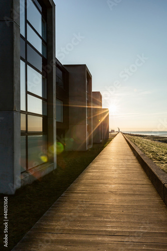 denmark, boardwalk, row, modern, summer, house, sunset, travel, journey, outdoors, atmosphere, architecture, exterior, holiday, villa, connection, scandinavia, house, building, nobody, wood, footbridge