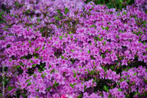 Dense clusters of vibrant pink and purple azalea flowers with green leaves covering a lush bush, symbolizing growth, beauty, and the arrival of spring in a tranquil garden setting