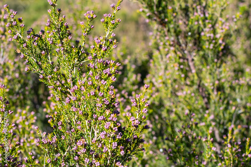 Densely packed green shrubs with scattered small purple flowers. The vibrant colors highlight the natural beauty of the flowering shrubs.