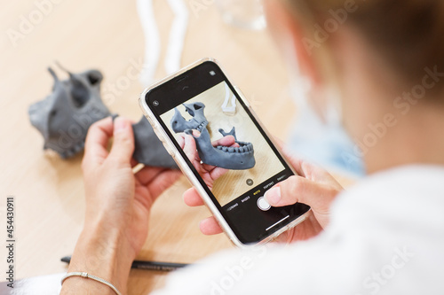 Dentist taking photo of 3d dental model on the table. Dental model with mini screw. Orthodontic dentistry. False teeth