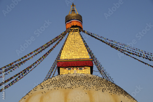 architecture, stupa, gold, temple, buddhist, kathmandu, building, nepal, culture, himalaya, mountain, religion, sacred, aged, big, buddhism, eye, buddha, gold, tibetan, flag, red, yellow, white, green, blue, vale, bird, pigeon, heaven, sunshine, morning, asia, horizontal