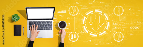 descending, arrow, financial, crisis, bad, recession, unemployment, crash, stock exchange, decayed, economy, economic, business, market, finance, concept, money, background, laptop, computer, notebook, tech, hand, technology, office, desk, digital, minimal, simplicity, up high, overhead, view, top, colours, yellow, high-coloured