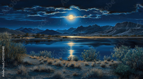 Desert Basin Lake with Full Moonlight Reflections in the Still Waters