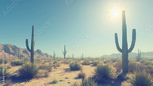 desert landscape under a clear blue sky, with the sun's rays casting a warm glow on the various tall cacti, highlighting the natural beauty and resilience of arid environments