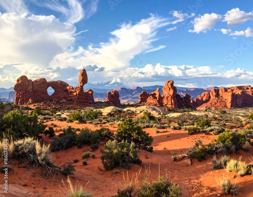 desert, landscape, sandstone, formation, arch, sky, cloud, blue, red, orange, nature, scenic, beauty, outdoors, travel, adventure, geology, erosion, vista, terrain, sun, light, shadow, contrast, structure, rock, wilderness, exploration, environment, majestic