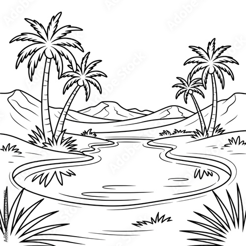 desert, oasis, colouring, page, palm, tree, river, dune, landscape, nature, illustration, outline, printable, vector, vignetting, drawing, artwork, scenery, tropical, sand, water, calm, relaxing, children, adult, therapy, mindfulness, creative, book, sheet, fantasy, arid, wilderness, minimal, simple, detailed, contour, ink, monochrome, background, scene, environment, travel
