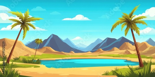 desert, oasis, landscape, lake, palm tree, mountain, sunny, scenery, nature, travel, adventure, vacation, tropical, panorama, background, illustration, vector, cartoon, flat, digital, relaxing, water, green, sand, scenic, relaxation, summer, exploration, journey, calm, serenity, calmness, peace, tour tourism, destination, hot