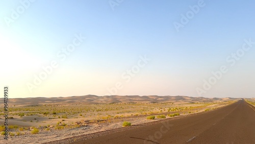 Desert road winds through evening dunes and small bushes under the fading light of sunset. Warm evening glow illuminates the path, offering a peaceful journey through the quiet, expansive desert.