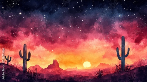 desert, sunset, star, night, sky, cactus, cactus, watercolor, painting, landscape, arid, nature, scenic, twilight, evening, horizon, mountain, rock, silhouette, plant, flora, colours, vibrant, red, orange, pink, purple, dark, light, beautiful, serene, peaceful, calm, background, illustration, art, artwork, image, picture, photo, design, texture