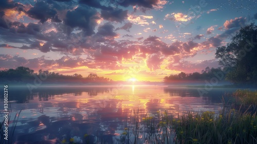 Design a digital artwork of a worms-eye view sunrise over a serene lake